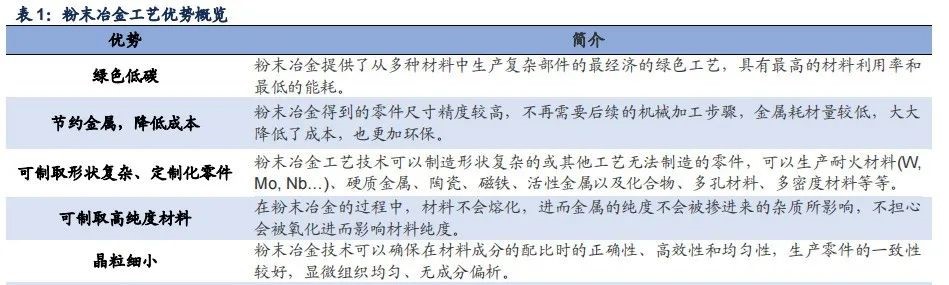 粉末冶金是一種綠色、低能耗、高材料利用率的技術(shù),符合高質(zhì)量發(fā)展趨勢(shì)粉末冶金工藝優(yōu)勢(shì)突出,為可持續(xù)發(fā)展帶來(lái)巨大空間。相比鑄造、鍛造等其他冶金工藝,粉末冶金是最先進(jìn)的金屬成形工藝,也是最綠色低碳的工藝。與傳統(tǒng)冶金工藝相比,粉末冶金材料利用率最高(95%以上,傳統(tǒng)機(jī)加工只有 50%)、能耗最低,根據(jù) EPMA,用于制造粉末冶金部件的原材料中約 80%來(lái)自回收廢料,在某些情況下,將鑄造或鍛造部件轉(zhuǎn)換為粉末冶金可節(jié)省 40%或更高的成本。除此之外,利用粉末冶金還可加工形狀復(fù)雜的零件,生產(chǎn)難熔的金屬以及化合物等。當(dāng)使用粉末冶金技術(shù)對(duì)統(tǒng)一形狀數(shù)量眾多的產(chǎn)品進(jìn)行生產(chǎn)時(shí),例如齒輪等費(fèi)用較高的產(chǎn)品,可以極大降低生產(chǎn)成本,提高生產(chǎn)效率。粉末冶金