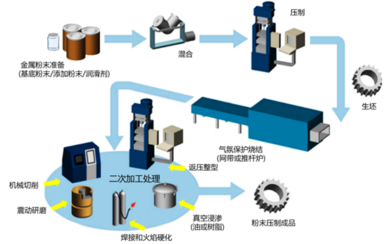 圖1.不同的粉末成形技術(shù)使用不同粒徑分布的金屬材料粉末注意到PM和MIM工藝用的粉末顆粒都和MAM工藝用的有交互重迭,其中MAM說(shuō)的DED(定向能量沉積)其實(shí)就是已經(jīng)習(xí)用的粉末熱噴涂,這種工藝在煉鋼廠早就用來(lái)修復(fù)軋鋼的滾軋柱,經(jīng)過(guò)調(diào)整修改設(shè)備成為3D打印用的技術(shù);粗粉的使用可以理解,同樣在細(xì)粉使用在增材制造也可以,但是固化3D建模的能量功率要降低,因此采用更低功率的激光和光斑(目前可以使用d50在3-5um的超細(xì)粉末,每層打印可以控制在0.01mm),或改用低溫的噴射粘結(jié)劑,成形後再使用無(wú)差別高溫?zé)Y(jié)固化得到最終零件。l生坯中至少的80%(同樣材質(zhì)以重量比即可,不同材質(zhì)的混合粉末必須換算成體積比)粉末粒徑小于30μm以下,同時(shí)生坯中的固體粉末堆積率>45vol%(體積分率),才能夠精準(zhǔn)的以阿基米得原理來(lái)推算最終產(chǎn)品的尺寸;l因此PM和MAM的部分技術(shù)是沒(méi)有辦法推算其生坯與燒結(jié)坯的尺寸比例關(guān)系;l各種技術(shù)發(fā)展所使用的粉末粒徑有一定的區(qū)隔,無(wú)法混合使用;l大于50μm以上的金屬粉末所具有的燒結(jié)驅(qū)動(dòng)力(Drive force of sintering)大幅降低,無(wú)法有效的大范圍燒結(jié)并且融合再一起,這導(dǎo)致尺寸控制的方式不容易推算其數(shù)學(xué)模型,干擾因素太多;lPM的壓制后尺寸和燒結(jié)后的尺寸誤差僅為千分之2(0.2%收縮率),主要是根據(jù)經(jīng)驗(yàn)累積;MAM使用熔融法則是精準(zhǔn)地控制激光光斑和熔池,尺寸的誤差約在0.5%;MIM與MAM燒結(jié)法采用MIM粉末制作成喂料,粉末的粒徑(>80%)小于30μm,才能在準(zhǔn)確的預(yù)測(cè)燒結(jié)后的產(chǎn)品尺寸。2.請(qǐng)簡(jiǎn)單描述PM/MIM/MAM的工藝流程圖,并比較之。答:2.1 PM (Press and Sinter)粉末壓制與燒結(jié)法的流程圖如圖2所表示,主力設(shè)備是僅能進(jìn)行上下閉合運(yùn)動(dòng)的壓機(jī)。這是一個(gè)近乎標(biāo)準(zhǔn)程序的流程,已經(jīng)有超過(guò)百年的歷史,進(jìn)步模具的設(shè)計(jì)和模架機(jī)構(gòu)使PM制品越來(lái)越精密且復(fù)雜。