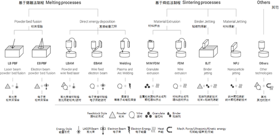2.3MAM以金屬粉末做為增材制造成形的方式目前有許多的方式,如圖4所表示。大致分成三大類,即將金屬粉末直接熔融法制程(Melting process)和燒結(jié)法制程(Sintering process),這些技術(shù)沒(méi)有統(tǒng)一的標(biāo)準(zhǔn),不過(guò)隨著技術(shù)的演變,也逐漸將材料、設(shè)備與方法清楚分類,并朝著更小的堆積層分辨率邁進(jìn),使用較小范圍的激光光斑、低溫成形(噴膠打印)、高溫同步固化,逐漸擴(kuò)大產(chǎn)品量產(chǎn)的應(yīng)用范圍以及產(chǎn)出效率的提升,或是朝更高分辨率前進(jìn)。