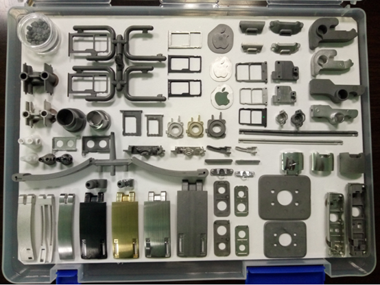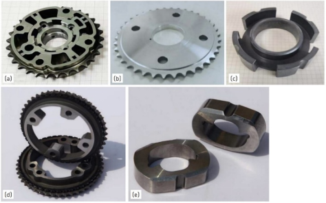 5. 每件產(chǎn)品的重量都超過(guò)100g以上的不同PM制品展示,:(a)VVT(可變氣門正時(shí))轉(zhuǎn)子/鏈輪;(b)鋁合金鏈輪;(c)軟磁定子;(d)橡膠包覆進(jìn)/排氣凸輪軸定子鏈輪(本零件榮獲世界PM2018產(chǎn)品獎(jiǎng));(e)密度≥7.53 g/cm3的打擊塊(本零件榮獲世界PM2018產(chǎn)品獎(jiǎng)),所有照片均由寧波東睦集團(tuán)NBTM提供。4.2 MIM製品MIM制品如圖6所表示,都是一些形狀復(fù)雜的零件且產(chǎn)品重量沒(méi)有超過(guò)50g,大部分都低于10g甚至有0.5g的小產(chǎn)品。 圖6.