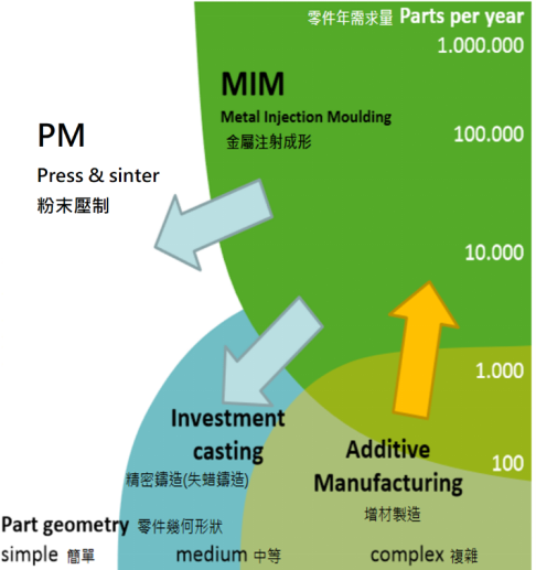 圖7.MAM的最新微米級(jí)3D打印5. PM/MIM/MAM工藝的產(chǎn)出能力答:如圖8非常淺顯易懂的表示三個(gè)工藝的產(chǎn)出能力特色。PM僅能制作中度復(fù)雜特征,但能制作大件/量大的訂單;MIM可以制作復(fù)雜特征產(chǎn)能很大,但是重量不大;MAM則是數(shù)量不多,但制品的重量和復(fù)雜度都沒(méi)有限制。特別是MIM原本僅是取代精密鑄造(Investment casting, 又稱熔模鑄造、失蠟鑄造或脫蠟鑄造),但是逐漸有侵入老大哥PM的領(lǐng)域,未來(lái)會(huì)更加大零件重量與尺寸的制造能力。
