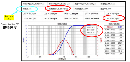 圖8.三大粉末成形技術(shù)的產(chǎn)出能力表示圖6.什么是d50(粉末平均粒徑的中值)?答:請(qǐng)見(jiàn)下圖9所表示,這是常見(jiàn)的激光粒度儀檢驗(yàn)后的綜合數(shù)據(jù)、表格與圖形。這圖是非常重要的粉末性能報(bào)告,一定要了解之中的含意。