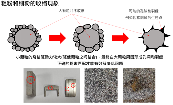 圖9.粉末激光粒度分析儀檢驗(yàn)后所獲的圖表lDXX(亦有小寫dxx)指的是平均粒徑的累積數(shù)值,其中XX是由0~100之間的數(shù)字,表示本批測(cè)量粉末顆粒數(shù)總量數(shù)字,當(dāng)粉末體是均質(zhì)物質(zhì)可以是重量比也可以理解為顆粒個(gè)數(shù)比,使用的是以含量%表示(藍(lán)色曲線)。lD10通常是累積到10%,D50到50%,以此類推。自然狀態(tài)下粉末的顆??倲?shù)會(huì)行成高斯分布狀態(tài)(紅色曲線),易即趨于中間值最多。l因此有四個(gè)重要的數(shù)值必須觀察:nD10 -這是可以作為最小粉末平均粒徑的依據(jù),通常小于D10以下的粉末顆粒都很細(xì)微,不過(guò)D10不能太小,過(guò)多細(xì)小的顆粒會(huì)導(dǎo)致制程中設(shè)備的高度摩擦,并使喂料容易摩擦熱裂解;nD50-粉末平均粒徑中值是整批粉末的代表數(shù)值,這是整批粉末中顆粒最多的范圍聚集后平均數(shù),購(gòu)買粉末與數(shù)學(xué)運(yùn)算的基礎(chǔ)數(shù)據(jù);nD90-這是較大粉末平均粒徑的代表,由此開始必須控制D90-D100粉末數(shù)量的百分比nD97-這是最大粉末粒徑的限制條件,也有部分儀器是表示D99或D100,大顆粒粉末數(shù)量過(guò)多會(huì)造成產(chǎn)品質(zhì)量的干擾,隨后將說(shuō)明。l比表面積可以代表受測(cè)粉末的整體性質(zhì),此數(shù)字月大代表粉末D50越朝細(xì)小前進(jìn),小的粉末有比較大的數(shù)量並造成比表面積增大,因此會(huì)導(dǎo)致成形過(guò)程的阻力(模具、工具與治具的磨損,送料困難)l跨度,粉末跨度越大,會(huì)導(dǎo)致產(chǎn)品的孔隙度的增加與表面缺陷,主要在於大顆粒與小顆粒在燒結(jié)驅(qū)動(dòng)力的差異,較小粉末團(tuán)聚很快緻密,但位於較小粉末堆中的大顆粒難以燒結(jié)收縮,缺陷便產(chǎn)生如圖10所表示。