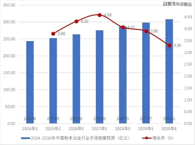 目前,粉末冶金技術已經(jīng)被廣泛應用于交通、機械、電子、航空航天、兵器、生物、5G通訊和新能源等領域。隨著這些領域對粉末冶金產(chǎn)品的需求逐漸增大,金屬粉末的需求預計將會在未來十年快速增長,預計2024-2030年中國粉末冶金行業(yè)市場規(guī)模平穩(wěn)上升,到2030年中國粉末冶金行業(yè)市場規(guī)模將達到307.81億元。